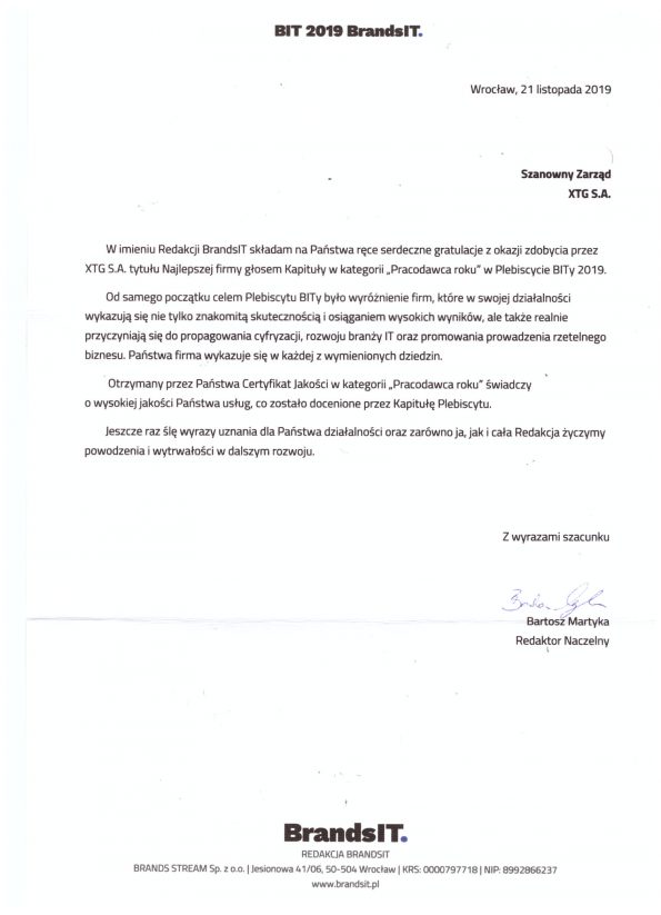 Wyniki plebiscytu BITy 2019 są już znane. Niezmiernie miło jest nam poinformować, że zdobyliśmy tytuł Najlepszej firmy głosem Kapituły w kategorii „Pracodawca roku”.