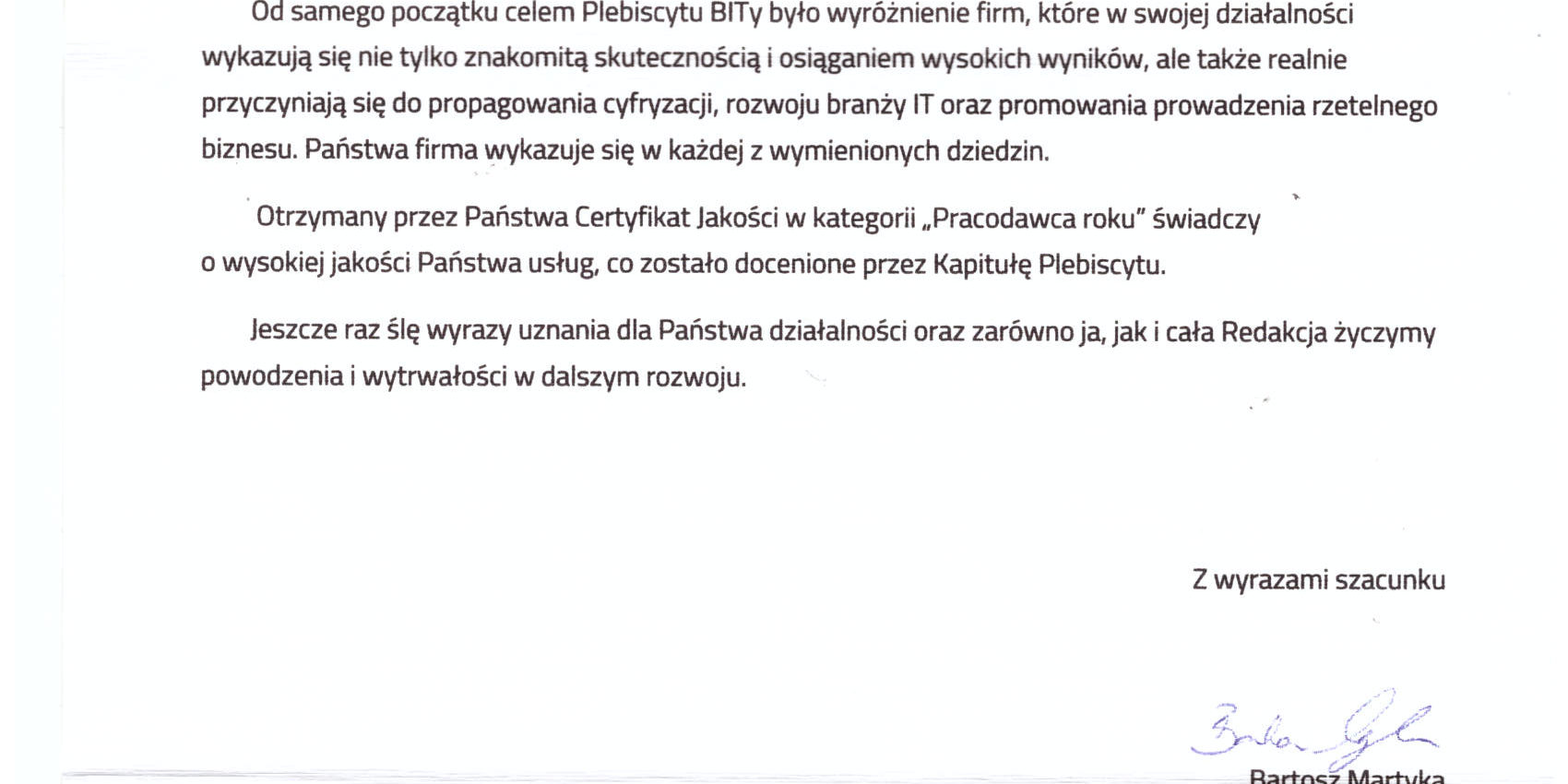 Wyniki plebiscytu BITy 2019 są już znane. Niezmiernie miło jest nam poinformować, że zdobyliśmy tytuł Najlepszej firmy głosem Kapituły w kategorii „Pracodawca roku”.
